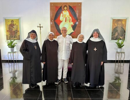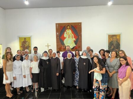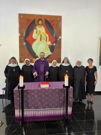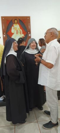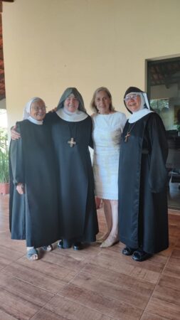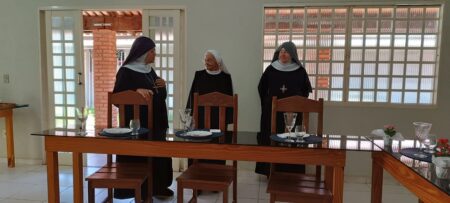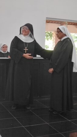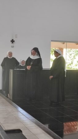 “Vamos fazer três Tendas. Deus não nos colocou um espírito de timidez. Por isso aqui estou. Em um dia memorável, quando dormi tranquila levando no coração simplesmente as preocupações inerentes a caminhada monástica, de repente Me. Maria Letícia resigna e eu sou nomeada Madre Prioresa dessa Casa de Deus. Nossa… a chave girou. E agora? “Ecce Ancila Domini.”Sou tua serva Senhor. Novos tempos. De trabalhar mais ainda. De fazer o Novo de Deus acontecer pela perspectiva da Sinodalidade. De unidade, de sintonia em todas as dimensões para construção do Reino de Deus nessa temporalidade. Encontro 2 diferenças em mim. Estou e Sou. ESTOU Prioresa e SOU tua Serva. Agradeço a confiança que Me. Abadessa Escolástica depositou em mim. Me Maria Letícia vivi todos esse anos tentando dar o melhor de mim, ajudando a senhora em sua missão de Madre dessa Casa de Deus. Deus o sabe, quantos desafios e enfrentamentos fizemos para chegar até aqui. Quantos lágrimas derramamos para consolidação do nosso Mosteiro. Porém aqui estamos e eu olho para a senhora e leio em seu rosto, as marcas de um tempo de muitas lutas. Quedas, alegrias e Conquistas. Valeu a pena acreditar! Por Deus tudo vale. Bendito seja Deus que nos sustentou e sustenta a cada momento, no deserto e na alegria. Rogo-Te, Oh meu Rei, que por intercessão da Virgem Maria Rainha desse Mosteiro, de nosso Pai S. Bento e de Santa Escolástica, que não confunda minha esperança. “Ecce Ancila Domini. “